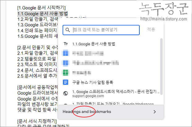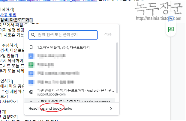 ▼ 링크 검색 화면에서 하단에 Headings and bookmarks 를 클릭합니다.