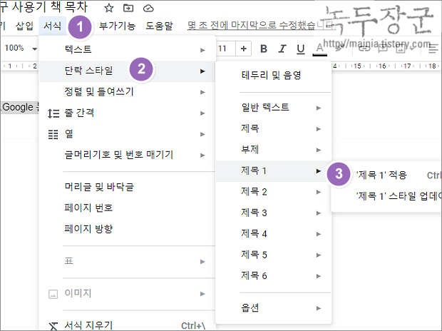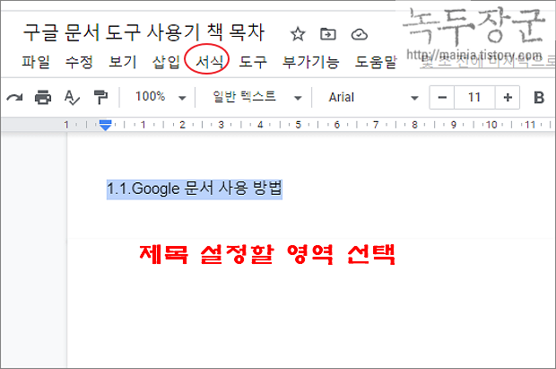▼ 제목 스타일을 이용해서 하이퍼링크를 걸어 보겠습니다. 먼저 내용이 있는 위치의 제목에 스타일 적용을 위해 선택합니다. 상단 서식 메뉴를 클릭합니다.