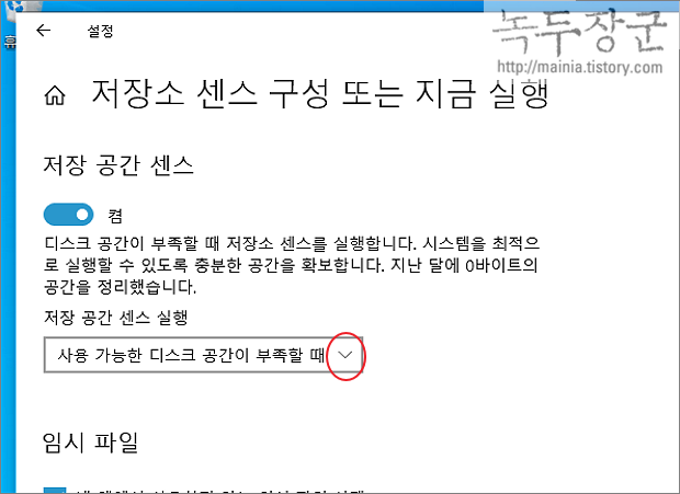 ▼ 자동으로 임시 파일을 제거하는 저장소 센스는 실행 주기와 조건이 있습니다. 기본은 공간이 부족할 때 실행합니다.