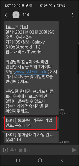▼ 통화중대기 서비스 가입이 완료되면 SMS 메시지를 알려줍니다.