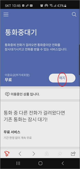 ▼ 해지는 간단합니다. 다시 해당 통화중대기 서비스 페이지로 들어와서 해지 버튼을 클릭합니다.