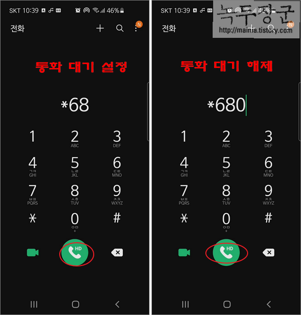 ▼ 먼저 통화 버튼을 이용해서 통화 대기 기능을 활성화해 보겠습니다. 통화 화면으로 이동해서 * 와 숫자를 이용해 *68 을 입력한 후 통화 버튼을 클릭합니다. 해제는 끝에 0 을 더 붙입니다.