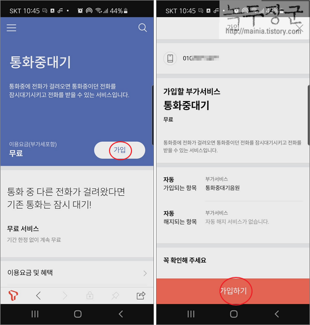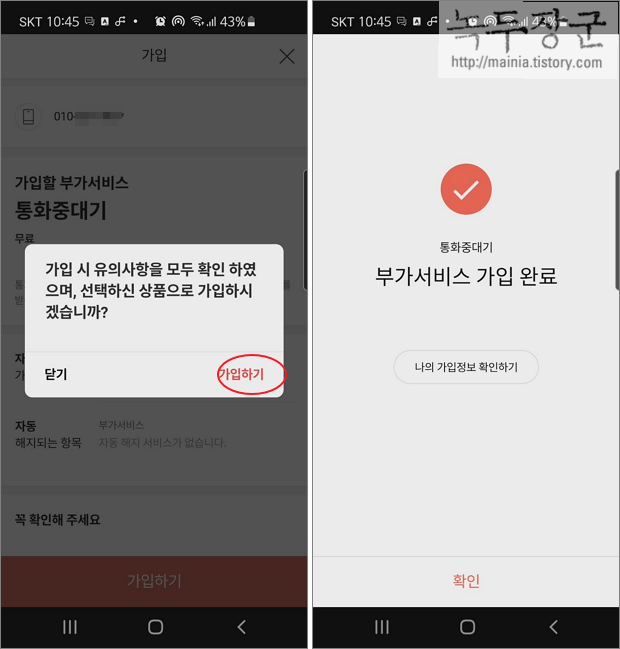 ▼ 통화중대기 서비스 상세 페이지로 이동해서 가입 버튼을 클릭합니다.