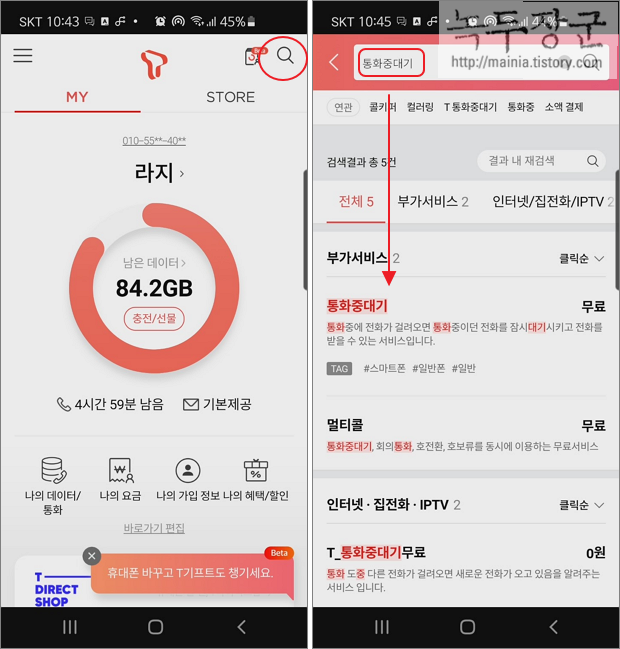 ▼ T World 에 로그인을 하고 검색 기능을 이용해서 "통화중대기" 서비스를 찾습니다. "T_통화중대기" 가 아니므로 헷갈리지 마세요.