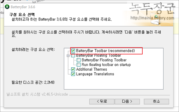 ▼ 설치 과정 중 하나인 구성 요소 선택에 있어서 BatteryBar Toolbar 는 필수로 체크합니다.