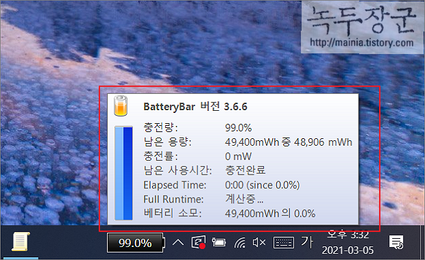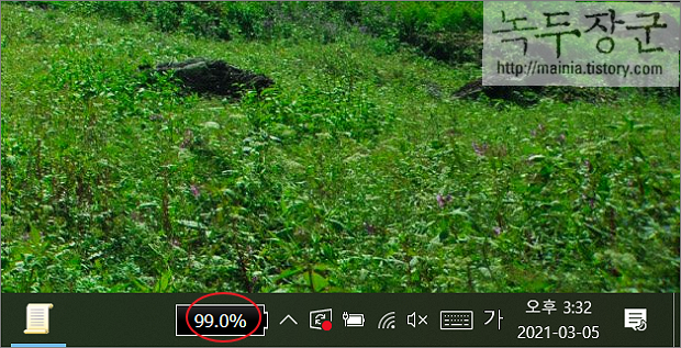 ▼ 설치가 끝나면 작업 표시줄 끝에 배터리 모양의 아이콘이 나타납니다. 현재 배터리 잔량이 숫자와 색깔로 표시되어 있습니다.