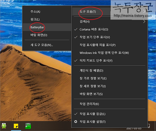 ▼ 작업 표시줄에서 삭제한 배터리를 다시 표시하고 싶다면 작업표시줄에 오른쪽 마우스를 눌러 도구 모음 > BatteryBar 메뉴를 선택합니다.