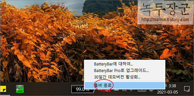 ▼ 배터리 아이콘을 화면에서 지우고 싶다면 오른쪽 마우스를 눌러 툴바 종료 메뉴를 선택합니다.