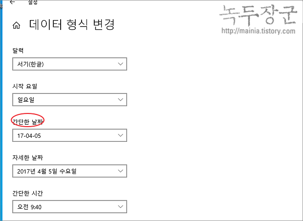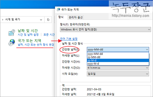 ▼ 날짜, 시간 또는 숫자 형식 변경 링크를 클릭하면 국가 또는 지역 대화상자가 뜹니다. 날짜 및 시간 형식 > 간단한 날짜 항목 값을 수정합니다.
