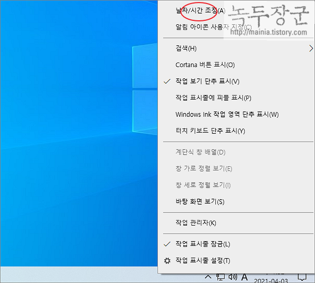 ▼ 오른쪽 마우스 메뉴 목록에서 상단에 있는 날짜/시간 조정을 선택합니다.