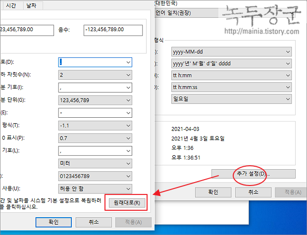 작업 표시줄 오른쪽 끝에는 현재 날짜와 시간을 표시합니다. 컴퓨터 작업할 때 별도의 시계를 볼 필요가 없어서 아주 유용합니다. 그런데 어떤 이유인지 모르지만 평소 사용하던 형식과 날짜 포맷이 다르다면 알아보기 힘들어서 불편합니다. 처음 윈도우를 설치할 때 보았던 날짜 포맷으로 초기화 하는 방법을 알아보겠습니다.