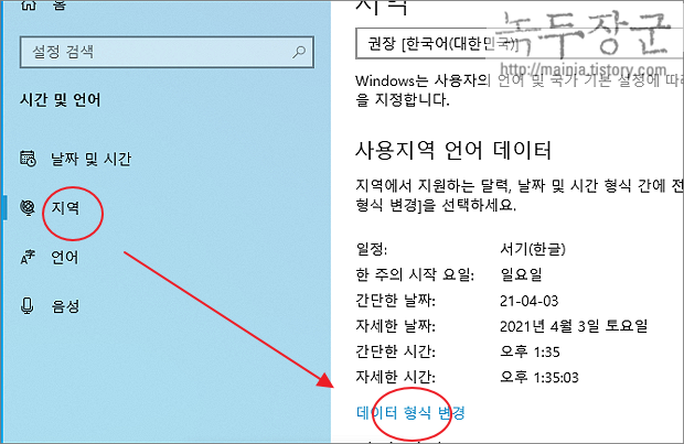 ▼ 날짜/시간 조정 설정 화면에서 지역 메뉴 > 데이터 형식 변경 링크를 클릭합니다.