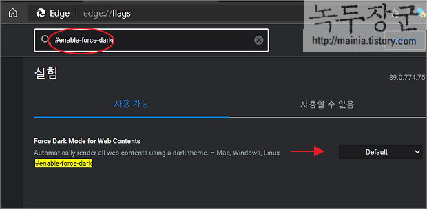 ▼ 다크모드 실험항목을 찾기 위해 검색어로 "#enable-force-dark" 를 입력합니다. 검색 결과에서 Force Dark Mode for Web Contents 로 이동합니다.