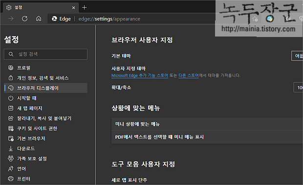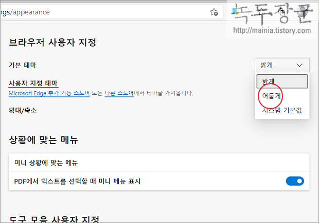 ▼ 브라우저 디스플레이 설정 화면에는 사용자 지정 테마 옵션이 있습니다. 오른쪽 끝으로 가면 선택 박스가 있는데, 밝게 를 어둡게 로 변경해 보세요.