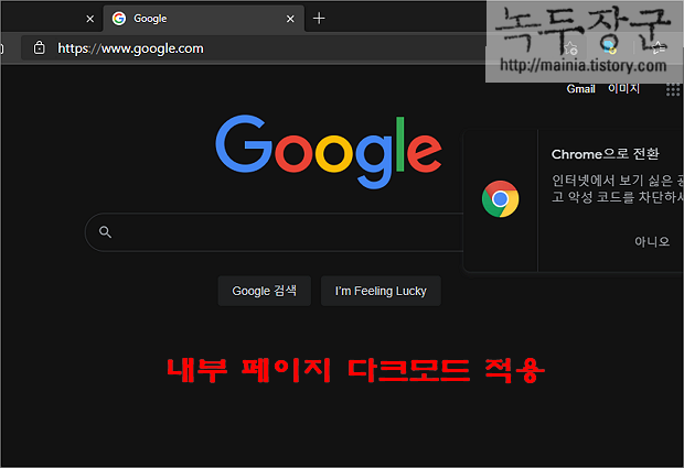 ▼ 하얀 바탕화면이었던 구글 페이지로 이동해 보세요. 이전과 달리 검은색 화면에 하얀색 텍스트가 화면에 나타날 겁니다.