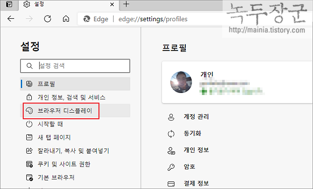 ▼ 설정 화면의 왼쪽 사이드 메뉴에서 브라우저 디스플레이로 이동합니다.