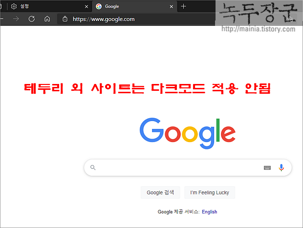 ▼ 하지만 브라우저 내부의 웹 사이트 페이지는 다크모드가 적용되지 않습니다. 웹 사이트까지 강제로 배경색을 어둡게 하기 위해서는 엣지에서 실험하고 있는 강제 다크모드 옵션을 적용해야 합니다.