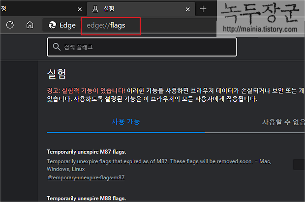 ▼ 다크모드 적용을 위해 실험실 옵션으로 이동하겠습니다. URL 입력란에 "edge://flags" 를 입력합니다.