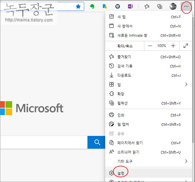 ▼ 엣지 브라우저를 실행하고 오른쪽 상단 더보기 > 설정 메뉴를 클릭합니다.