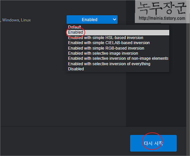 ▼ Force Dark Mode for Web Contents 의 오른쪽 끝에 Default 옵션을 Enabled 로 변경합니다. 옵션 변경을 적용하기 위해서는 브라우저를 다시 시작해야 합니다. 화면 하단에 다시 시작 버튼을 클릭합니다.