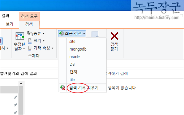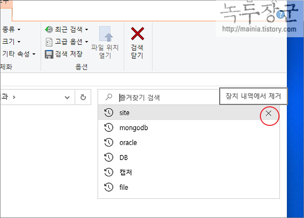윈도우 탐색기에는 기본 검색 도구가 있습니다. 여기에는 기존 검색 흔적이 남습니다. 검색창에 커서를 두면 기존 검색어 목록을 볼 수 있습니다. 이것은 사용자 편의를 위한 기능으로 자주 사용하는 검색어는 입력없이 사용할 수 있어서 편합니다. 검색 정보는 다른 사람에게 노출하고 싶지 않는 경우 삭제가 가능합니다.