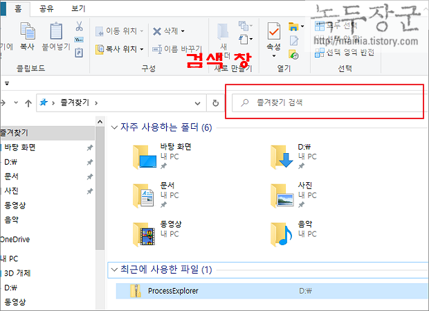 ▼ 검색창에 뜨는 검색어를 하나씩 삭제하는 방법입니다. 탐색기를 실행하고 오른쪽 상단의 즐겨찾기 검색 란에 커서를 둡니다.