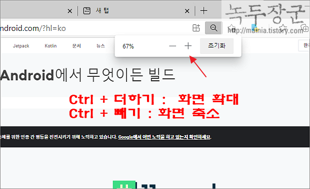 ▼ Ctrl + 더하기/빼기(마우스휠 위/아래) : 기본 100% 인 화면을 확대하거나 축소할 때 사용합니다. Ctrl 키를 누른 상태에서 마우스 휠을 위로 올리거나 내려 화면을 조절합니다. 브라우저 상단에는 축소/확대 값을 % 로 보여줍니다. 바로 옆 초기화 버튼은 기본 값인 100% 로 복구합니다.