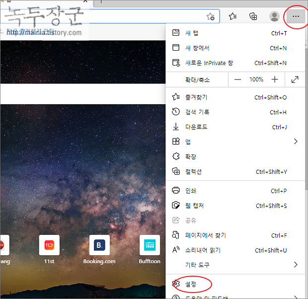 ▼ 이번에는 화면에 검색어 제안이 뜨지 않도록 설정을 변경해 보겠습니다. 엣지 브라우저 오른쪽 상단 더보기 > 설정 메뉴를 클릭합니다.