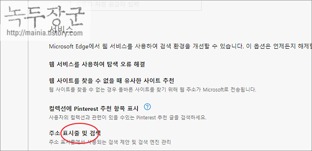 ▼ 서비스 > 주소 표시줄 및 검색 메뉴를 클릭해서 상세 설정 페이지로 이동합니다.