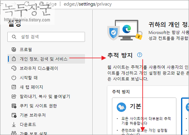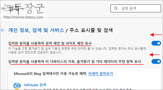 ▼ 주소 표시줄 및 검색 상세 설정 페이지에서 아래 두가지 항목을 모두 사용 안함으로 변경합니다. 이제 입력란에는 자동 완성 검색어가 뜨지 않을 겁니다.