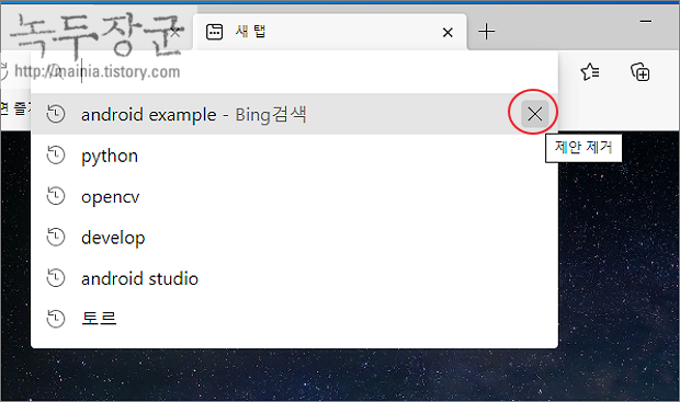 ▼ 기존 검색어를 삭제하는 방법은 간단합니다. 검색어 목록에서 오른쪽 끝으로 가 마우스로 제안 제거인 X 버튼을 클릭합니다. 삭제할 검색어가 많은 경우 비효율적인 방법입니다.