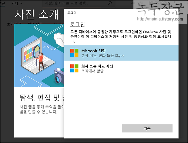 ▼ 처음 사진 앱을 시작하면 마이크로소프트 계정에 로그인 할 것인지 묻습니다. 사진 앱은 로그인 없이 사용 가능합니다. 오른쪽 상단에 X 버튼을 눌러 창을 닫습니다.