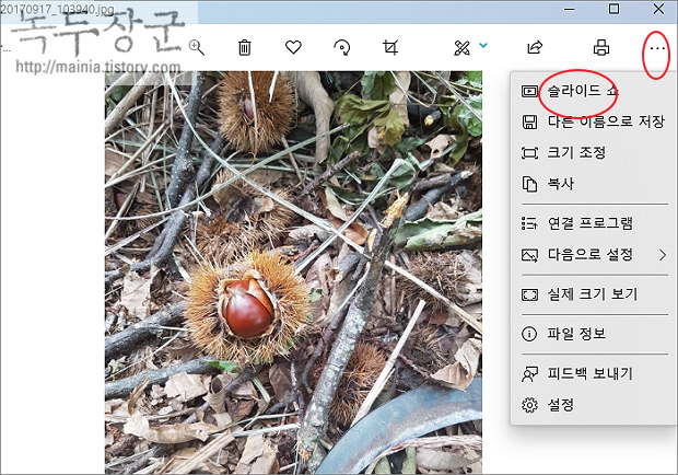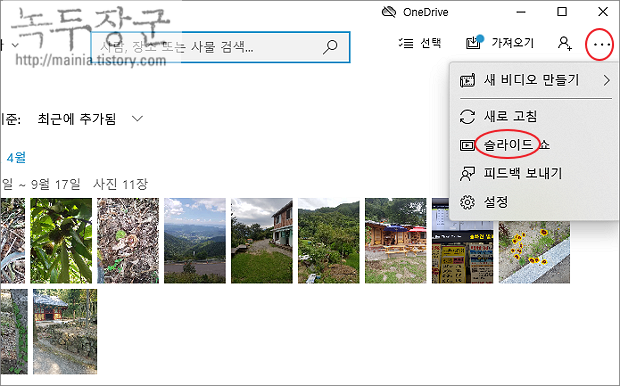 ▼ 다음은 오른쪽 상단에 더보기 > 슬라이드 쇼 메뉴를 클릭합니다. 목록에 있는 전체 사진을 대상으로 슬라이드 쇼가 진행됩니다.