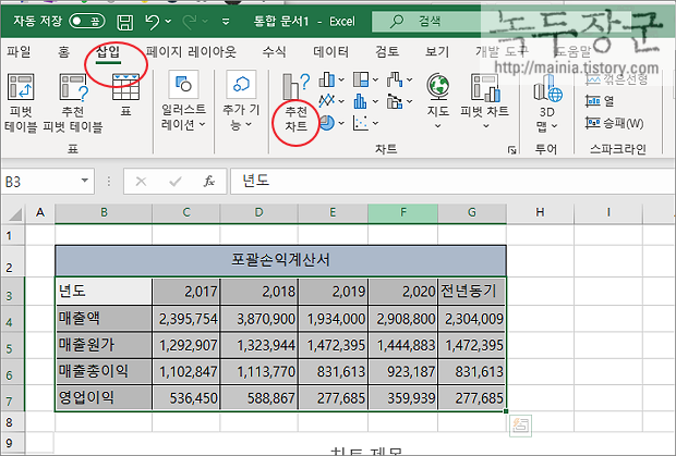 ▼ 저 데이터를 선택하고 차트를 추가해 보겠습니다. 상단 삽입 탭 > 추천 차트 리본 메뉴를 클릭합니다.