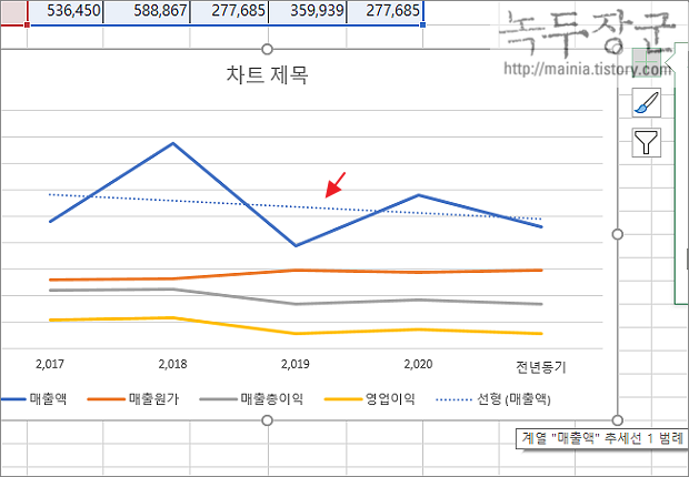 ▼ 매출액에 대한 추세선을 선택해서 추가했습니다. 그림처럼 점선으로 계열과 같은 색상의 추세선이 그려졌습니다.
