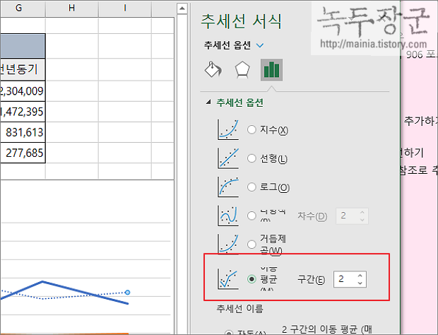▼ 오른쪽 사이드에는 추세선 서식 창이 나타납니다. 이전에 추가했던 직선의 추세선은 선형 입니다. 선형 이외의 5가지가 더 있습니다. 이 중에서 이동평균을 선택합니다. 구간은 최소 2 이상이어야 합니다. 그러니까 구간은 평균값을 위한 범위를 말합니다. 2는 2개의 구간값 평균으로 이동평균선을 그린다는 의미입니다.
