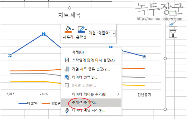 ▼ 다음은 이동평균선을 추가해 보겠습니다. 계열을 선택하고 오른쪽 마우스를 눌러 추세선 추가 메뉴를 선택합니다.