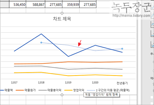 ▼ 결과는 다음과 같습니다. 선택한 계열의 이동평균선이 점선으로 화면에 나타났습니다.