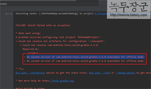 ▼ 네트워크가 정상인데 아래와 같은 No cached version available for offline mode 에러가 발생한다면 Gradle 옵션에 문제가 있는 것입니다. Gradle 빌드 옵션에서 오프라인으로 설정이 되어 있기 때문에 에러가 발생한 것입니다. 해당 옵션은 안드로이드 3.6 버전 이상에서 지원하는 옵션입니다. 그림처럼 콘솔에 빌드 과정에서 gradle offline mode 에러가 발생하는 경우 어떻게 조치하는지 알아보겠습니다.