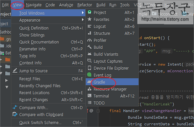 ▼ 옵션을 변경하기 위해서 Gradle 빌드 창을 띄우겠습니다. 상단 메뉴 View > Tool Windows > Gradle 메뉴를 선택합니다.