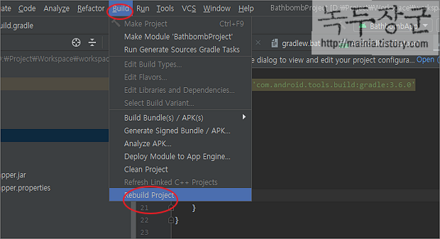▼ Gradle 오프라인 모드 해제가 되었다면 다시 프로젝트를 빌드합니다. Build > Rebuild Project 메뉴를 선택합니다.