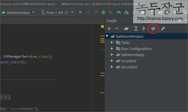 ▼ 왼쪽 사이드에 나타난 Gradle 빌드 창에서 상단에 오프라인 모드를 해제합니다. 토글이 되어 있으면 오프라인 모드입니다. 한번 클릭할 때마다 해제/설정을 반복합니다.