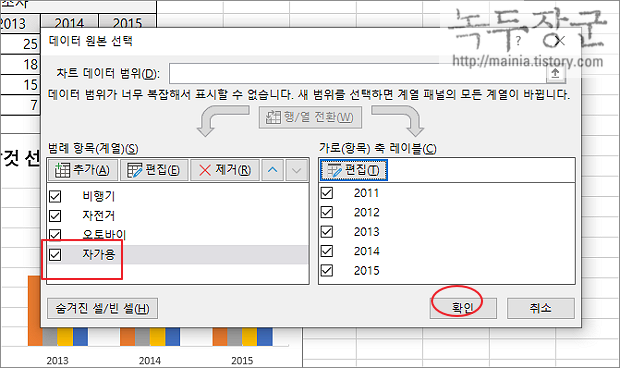 ▼ 그림처럼 첫 번째에 있던 "자가용" 을 제일 아래로 옮겼습니다. 확인 버튼을 눌러 데이터 원본 선택 대화상자를 닫습니다.