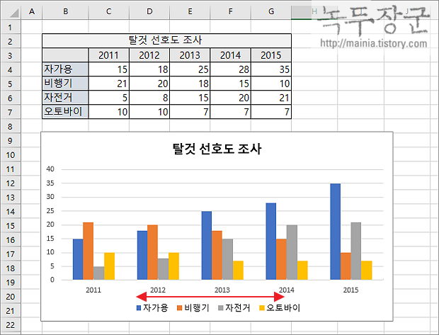 막대 차트에서 그래프 모양을 좀 더 보기 좋게 계단식으로 증가하는 모양으로 배치하고자 합니다. 어떻게 해야 할까요? 다시 말해 범례 항목의 순서를 바꾸는 것입니다. 차트에 사용한 데이터 시트의 순서를 변경하지 않아도 됩니다. 데이터 원본 선택 대화상자에서 범례 항목의 순서를 클릭 한 번으로 조절할 수 있습니다.