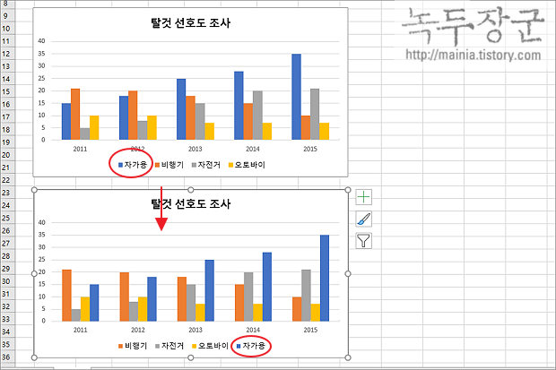 ▼ 범례의 순서를 이동하기 전과 후의 모습은 아래와 같습니다.