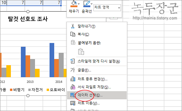 ▼ 차트를 선택하고 오른쪽 마우스를 클릭합니다. 메뉴 목록에서 데이터 선택을 선택합니다.
