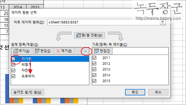 ▼ 데이터 원본 선택 대화상자에서 범례 항목으로 갑니다. 목록에서 위치를 변경하고 싶은 항목을 선택합니다. 다음 오른쪽 상단에 위/아래 버튼을 눌러 위치를 조절합니다.