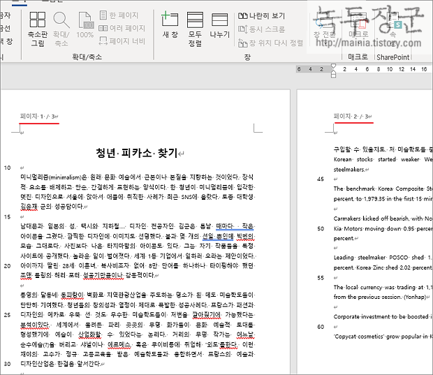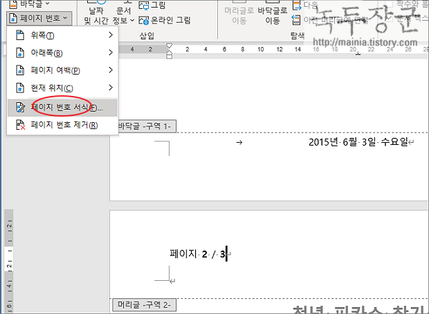 ▼ 그림처럼 2/3 이었던 페이지 시작번호가 1/3 으로 바뀌었습니다.