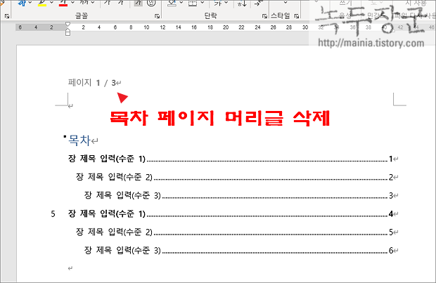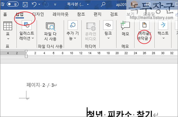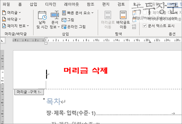 ▼ 다음은 목차가 있던 첫 페이지의 머리글을 삭제하겠습니다. 머리글/바닥글 편집 화면을 활성화 하고 왼쪽 끝에 머리글 리본 메뉴를 클릭합니다.