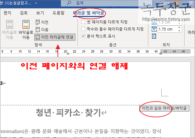▼ 화면에 머리글 편집 화면이 뜨면 머리글 및 바닥글 탭이 나타납니다. 머리글 오른쪽 부분에 보시면 "이전과 같은 머리글/바닥글" 이라는 문구가 보일 겁니다. 이전 페이지와 머리글이 연결되어 있기 때문에 페이지 번호가 차례대로 매겨지는 것입니다. 연결을 끊으면 별도의 페이지 번호를 시작할 수 있습니다. 탐색 그룹 > 이전 머리글에 연결 버튼을 클릭해서 해제합니다.